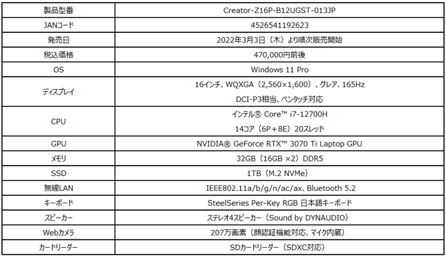 ・Creator Z16P B12U製品ページ:https://jp.msi.com/Content-Creation/Creator-Z16P-B12UX