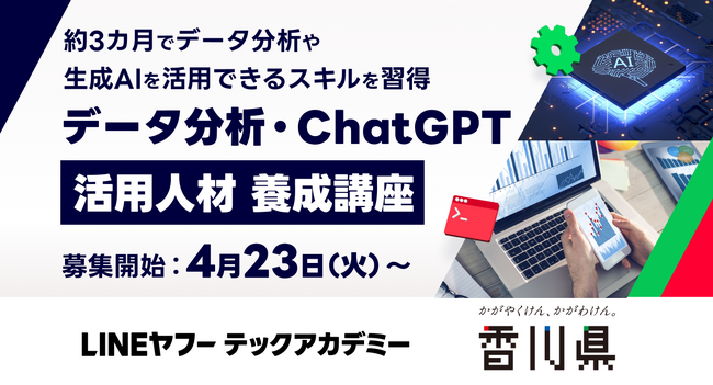 本件は、香川県が主催する「データ分析・ChatGPT人材活用講座」の運用企業を公募する中で、キラメックスが業務委託契約を締結し採択されたもので、LINEヤフーとキラメックスが共同で運営するリスキリングプログラム「LINEヤフーテックアカデミー」を通じてデータ分析や生成AIを実務で活用するためのノウハウを香川県に提供します。
