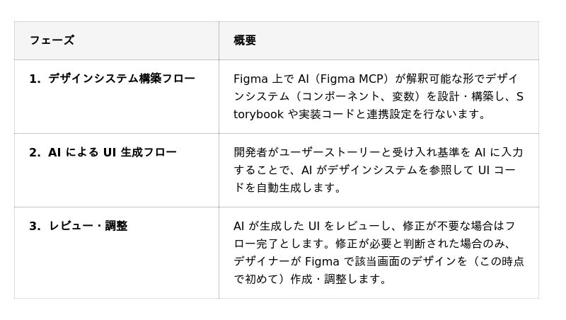 また、ベストケースとして「デザインシステム(Figma)だけ整備すれば、個別画面のデザイン作成は不要」な状態を目指します。