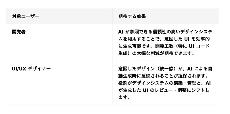 本サービスは、「全画面デザイン作成」を原則廃止し、AI が参照可能なデザインシステムを基盤とすることで、AI 駆動開発におけるデザイン統一性と UI コード生成のスピードを極限まで高めます。