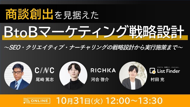 株式会社イノベーション(東証グロース 証券コード3970)のグループ会社である、株式会社Innovation X Solutions(本社:東京都渋谷区、代表取締役社長:遠藤俊一、以下「Innovation X Solutions」)は、2023年10月31日(火)に開催される「商談創出を見据えたBtoBマーケティング戦略設計 〜SEO・クリエイティブ・ナーチャリングの戦略設計から実行施策まで〜」をテーマとしたセミナーを株式会社リチカ、株式会社CINCと共催で開催します。