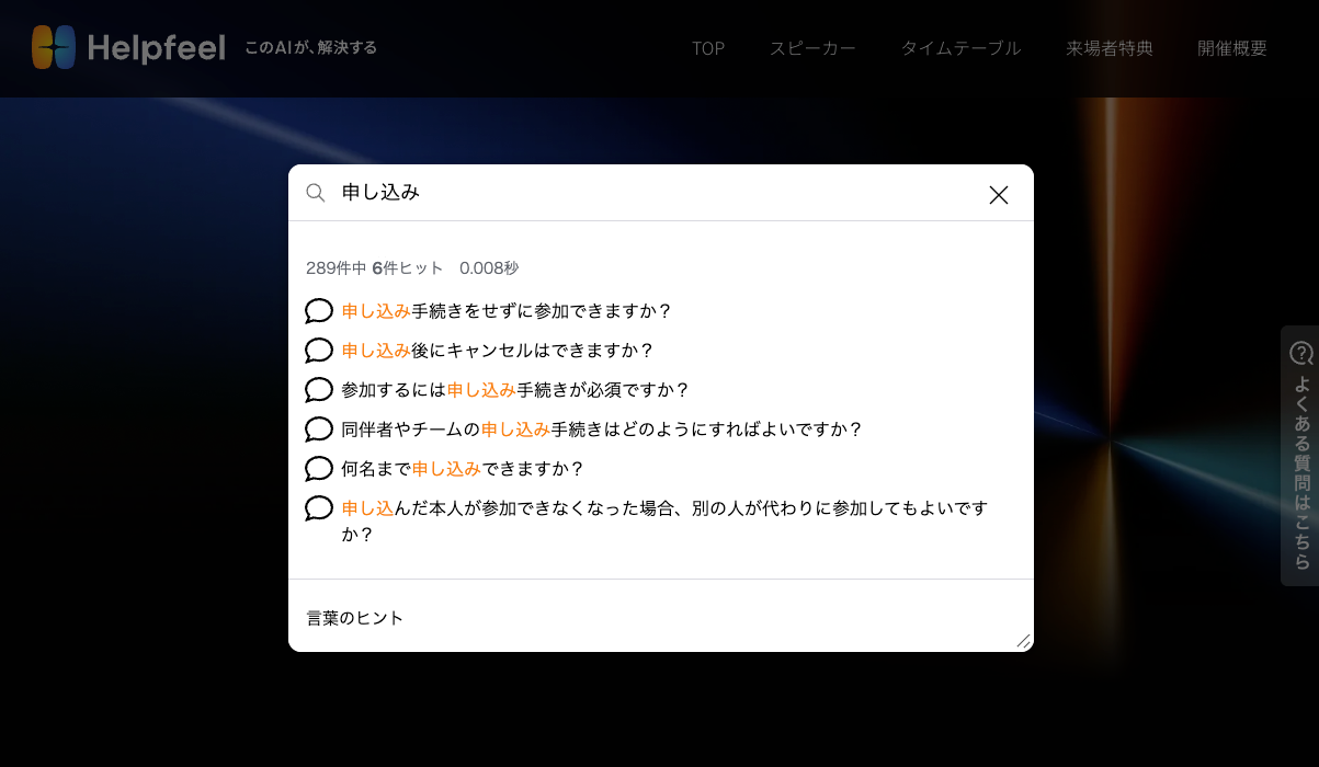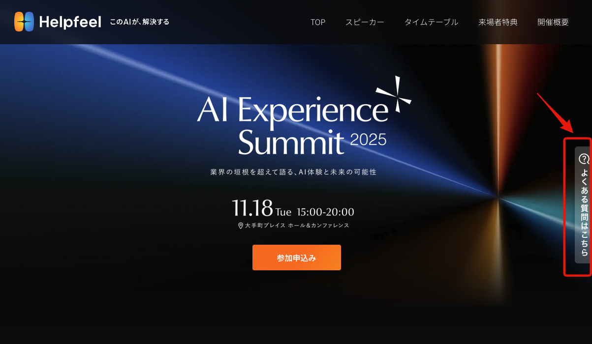 なお、本イベント公式サイトのFAQとして、Helpfeelのナレッジ検索システムを設置しております。画面左手の「よくある質問はこちら」、または、FAQボタンからご利用いただけます。