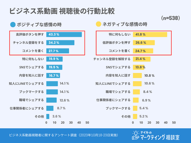 ビジネス系動画を視聴した後の行動について、「動画の内容がためになった、面白かった」などのポジティブな感情になった場合と、「動画の内容がためにならなかった、面白くなかった」などネガティブな感情になった場合の行動を比較しました。