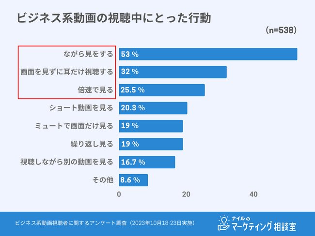 ビジネス系動画の視聴中にとったことがある行動として、半数以上が「ながら見をする(53%)」と回答しました。