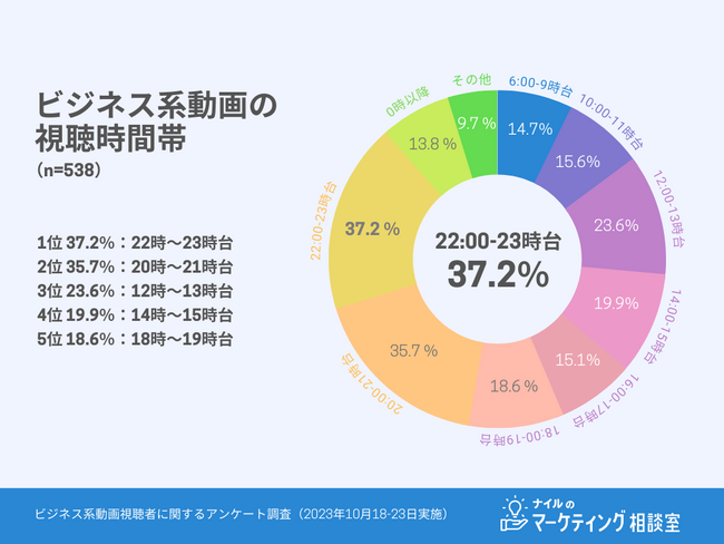 ビジネス系動画を視聴する時間帯の1位は「22時〜23時台(37.2%)」、2位「20〜21時台(35.7%)」、3位「12時〜13時台(23.6%)」でした。