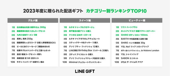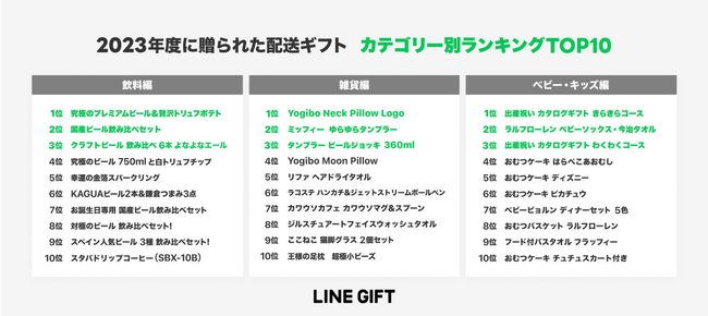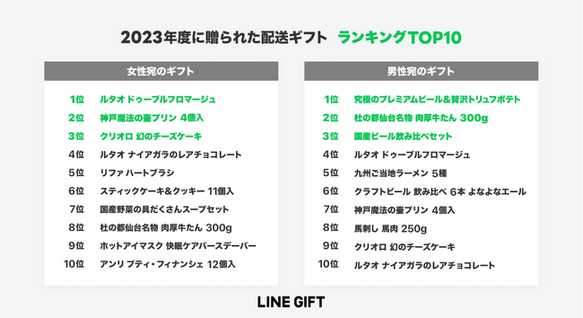 LINEヤフー株式会社が提供する「LINE」を通じて友だちにさまざまなプレゼントを贈ることができるサービス「LINEギフト」は、2023年度における人気ギフトランキングを公開しました。女性・男性宛にどのようなギフトがよく贈られていたか、カテゴリーおよびシーズナルイベントや記念日・年中行事ごとの人気ギフトに関する結果をお知らせします。
