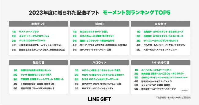 ※4 各モーメントの特集ページにおける、特集ページ公開期間中に贈られた配送ギフトの取引件数を集計(LINEギフト調べ)