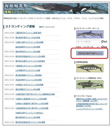▼「海棲哺乳類ストランディングマップ」の入り口は、「海棲哺乳類ストランディング情報データベース(https://www.kahaku.go.jp/research/db/zoology/marmam/index.php )」の画面右側にあります。