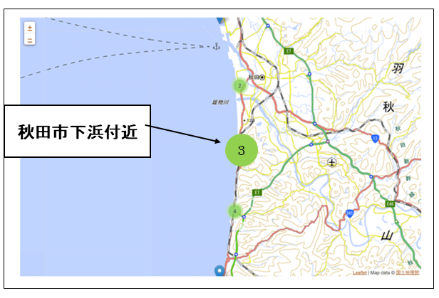 ▼ STEP2.:我が国でオウギハクジラが最初に発見されたのは1960年秋田県の下浜の海岸であることが分かっています。この情報をもとに、都道府県名のプルダウンから「秋田県」を選び、地名に「下浜」を入力して検索してみると、どうやら3件の登録があるようです。