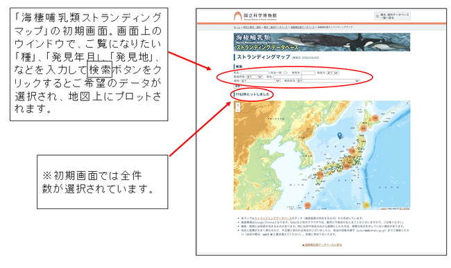 独立行政法人国立科学博物館(館長:篠田謙一)は、国内で発生した鯨やイルカなど海棲哺乳類のストランディング(海岸に打ち上がってしまう現象)事例を検索して地図上に示し、視覚的に比較・考察できるコンテンツ「海棲哺乳類ストランディングマップ」を公開しました。