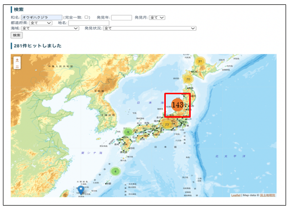 ▼STEP1.:「オウギハクジラ」を検索した画面です。ヒットしたのは281件。本州日本海側の143件に注目!