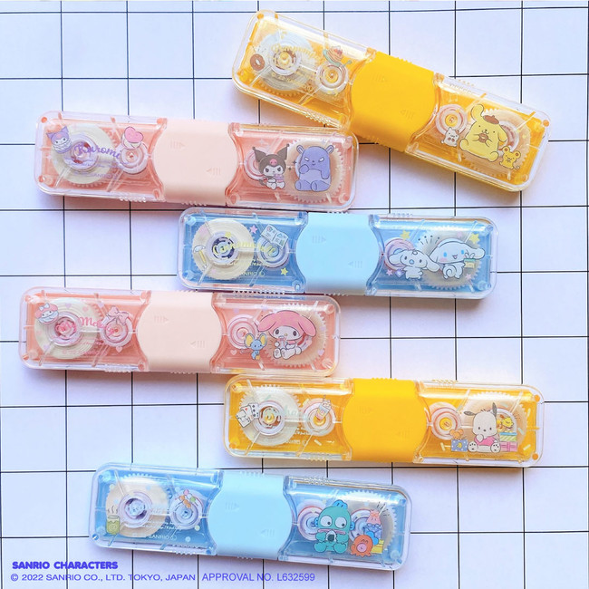 修正テープ&テープのりがまとめて持てるダブルテープは1本で2つの機能を果たす有能文具です。学生にとって使用頻度が高い2つの文具を、約縦3cm×横11cmとコンパクトなサイズ感で、ペンポーチにスッキリ収納して持ち歩くことができます。2022年サンリオキャラクター大賞でもTOP10にランクインした「シナモロール」「ポムポムプリン」「クロミ」「ポチャッコ」「マイメロディ」「ハンギョドン」といった人気キャラクターたちのキュートなデザインです。