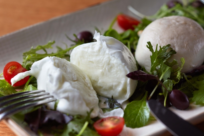 また"モッツァレラ"とは、「引きちぎる」を意味するイタリア語「mozzare」に由来します。機械でカット・成形した商品が大量生産されるなか、職人が一つずつ手でちぎって(ハンドカット)成形するものは希少なモッツァレラチーズといえます。