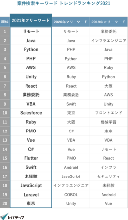 レバテック株式会社が運営する、フリーランスITエンジニアのための案件紹介サービス『レバテックフリーランス』( https://freelance.levtech.jp/ )は、「案件検索キーワード トレンドランキング2021」*1を発表します。