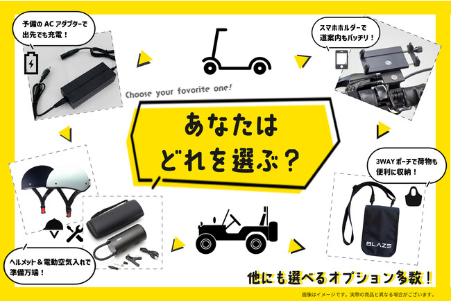 ブレイズの提唱する新ブランドコンセプト「LIFE EV」(*下記参照)の下に展開する電動モビリティをご購入のお客様に、お好きなオプション品をプレゼントいたします。