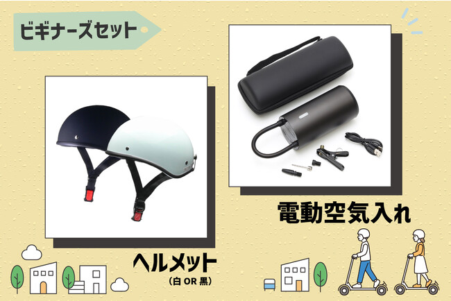 お客様の安全のために必要な「ヘルメット」および電動バイクのメンテナンスに必要な「電動空気入れ」のセットとなります。