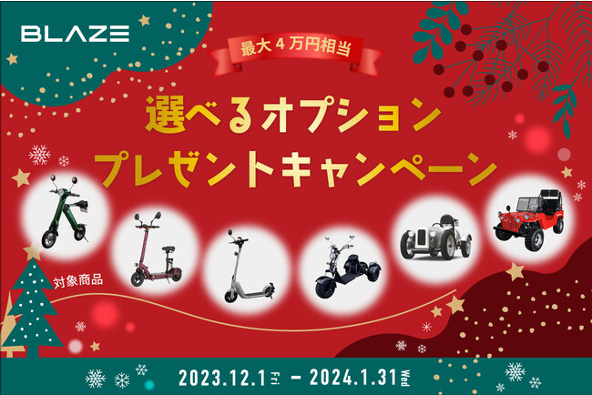 株式会社ブレイズ(愛知県名古屋市、代表取締役:市川秀幸、以下ブレイズ)は、2023年12月1日(金)〜2024年1月31日(水)の期間、ブレイズの電動モビリティをご購入のお客様に最大4万円相当のオプション品をプレゼントする「選べるオプションプレゼントキャンペーン」を実施いたします。