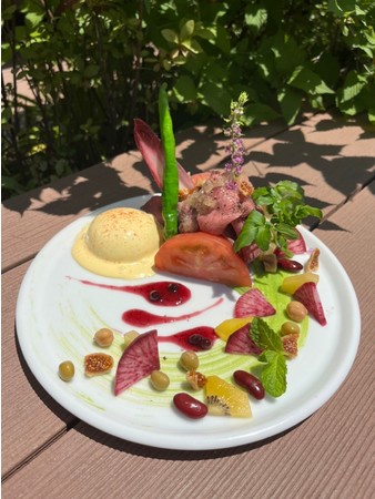 旬のゴールドキウイやブルーベリー、白イチヂクと色とりどりの野菜のマリアージュを