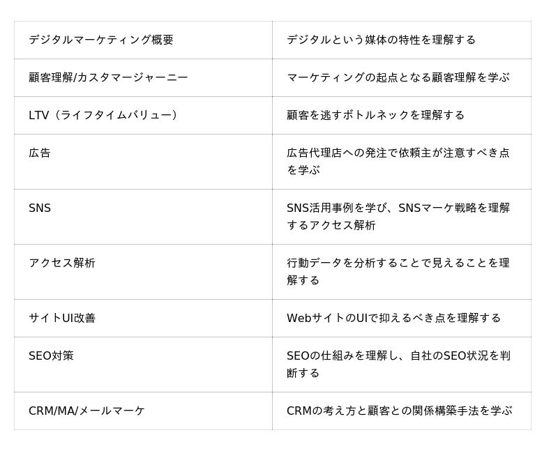 そこで、体系的な知識の習得に加え、自社の実務課題を題材としながら実践的に学べる場として、「デジタルマーケティング講座」を新たに開発しました。本講座を通じて、デジタルマーケティング領域におけるDX推進人財の育成と、グループ全体のマーケティング力向上を目指しています。