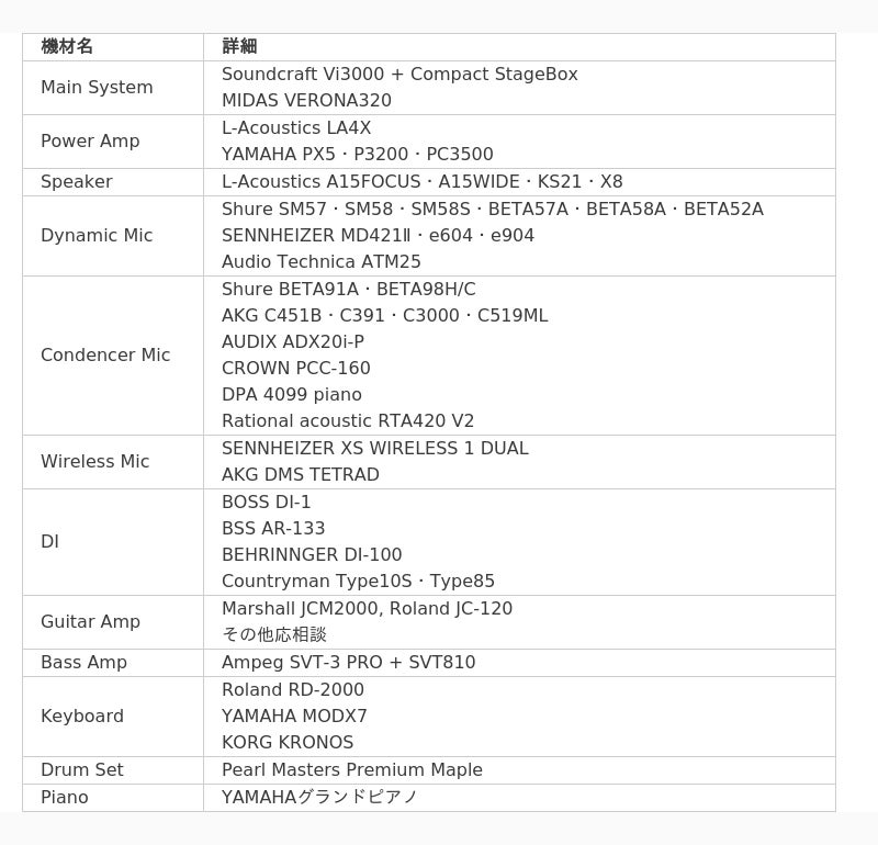 設置機材 詳細情報