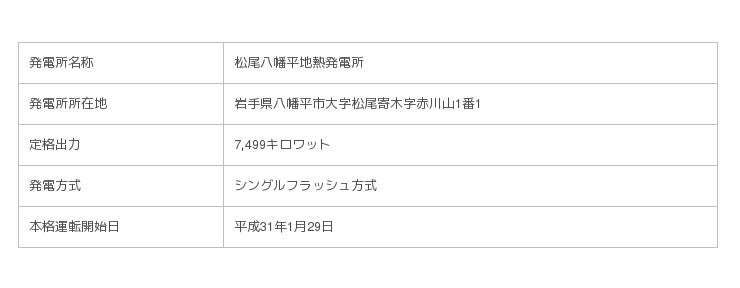 本年1月29日、同社は松尾八幡平地熱発電所の本格運転を開始しました。出力7,000キロワットを超える地熱発電所の稼動は国内では22年ぶりとなります。発電した電力は東北電力株式会社へ売電し、アーバンエナジー株式会社(注)が特定卸供給先となっております。
