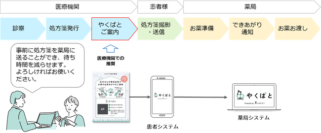 「やくばと」は、医療機関を起点にした処方箋画像事前送信サービスとして2022年7月にリリース以降、導入医療機関数、さらに導入薬局数も増やしています。以前より処方箋FAXコーナーが果たしていた機能を、アプリインストール不要でスマートフォンで簡便に実現することで、医療機関における診療から薬の受け取りまでのトータルの受診行動における患者さまの「待ち時間負担」や「感染リスク」を軽減するサービスとして導入が進んでいます。