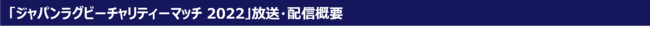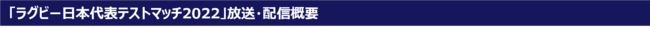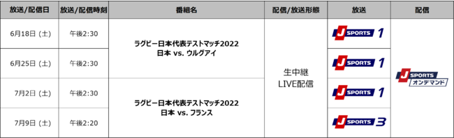国内最大4チャンネルのスポーツテレビ局、株式会社ジェイ・スポーツ(本社 東京都江東区、代表取締役社長 長谷 一郎、以下「J SPORTS」 ※1)は、6、7月にウルグアイ代表、フランス代表を日本国内に招いて行う「ラグビー日本代表テストマッチ2022」の全4試合を生中継いたします。また、6月11日(土)に開催されるトンガ復興支援チャリティーマッチはJ SPORTS独占で生中継いたします。これらの5試合は、PC、スマホ、タブレットで見られる動画配信サービス「J SPORTSオンデマンド」 ※2 でもLIVE配信いたします。