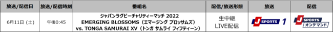 また、4連戦に先駆けて6月11日(土)には、今年1月15日に発生したトンガの海底火山噴火による被災者救援と、被災地域の復興支援を目的とした「ジャパンラグビーチャリティーマッチ2022 EMERGING BLOSSOMS vs. TONGA SAMURAI XV」も開催されます。 EMERGING BLOSSOMSは、日本代表に選出される可能性のある、高いポテンシャルをもった選手が招集されるNDS(ナショナル・デベロップメント・スコッド)のメンバーを中心に編成される特別チームです。一方のTONGA SAMURAI XVは、ジャパンラグビー リーグワンから、トンガ出身またはトンガにルーツを持つ選手を選出したチームで、こちらもラグビーワールドカップ2023へ向けて目が離せない一戦です。