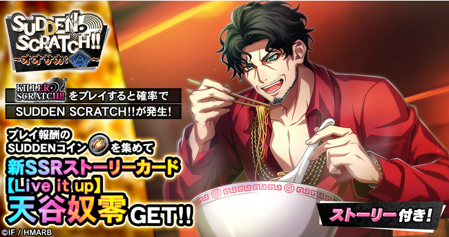 イベント期間中、KILLER SCRATCH!!をプレイするとライズ消費量に応じた確率でSUDDEN SCRATCH!!が発生します。SUDDEN SCRATCH!!をプレイすると、通常の報酬アイテムの他、限定アイテム「SUDDENコイン」を獲得することができます。「SUDDENコイン」を集めることで、ストーリーカード「SSR【Live it up】天谷奴零」と交換することが可能です。詳細はアプリ内お知らせをご確認ください。