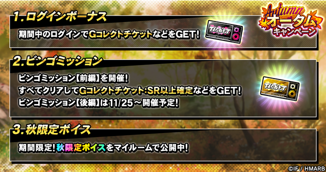 期間中、すべてのミッションをクリアすると「Gコレクトチケット:SR以上確定」を獲得できるビンゴミッションのほか、ログインボーナスなどを開催しています。詳細はアプリ内お知らせをご確認ください。