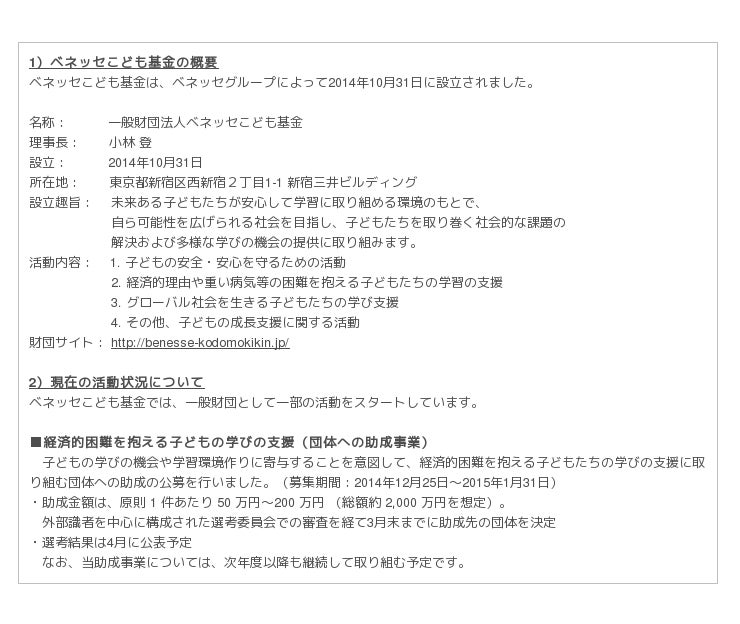 また、併せまして、株式会社ベネッセコーポレーションより、ベネッセこども基金に対して寄附を行うことを決定しました。