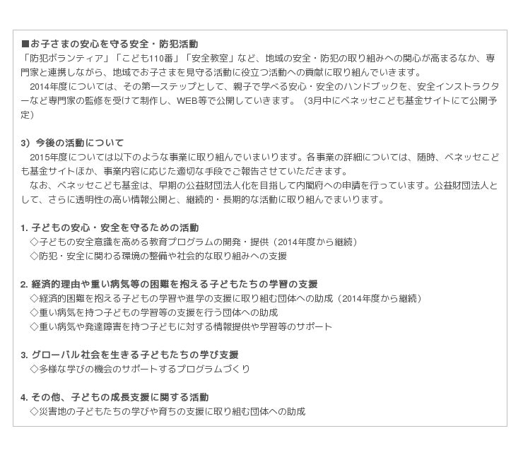 なお、ベネッセこども基金は、未来ある子どもたちが安心して学習に取り組める環境のもとで、自ら可能性を広げられる社会を目指し、子どもたちを取り巻く社会的な課題の解決および多様な学びの機会の提供に取り組むことを目的とした財団です。(P.2以降に記載)