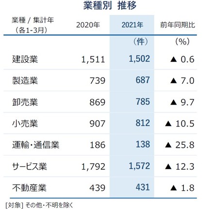 業種別では、全7業種で前年同期を下回った。なかでもトラック輸送など運輸・通信業(2021年1-3月:186件→22年同:138件)は前年同期比25.8%の急減となったほか、小売業(907件→812件)、サービス業(1792件→1572件)でも2ケタの大幅減少となった。小売業では、引き続き飲食店が減少傾向で推移(144件→127件)しているほか、サービス業でもリーマン・ショック後以来のハイペースだったホテル・旅館が、2021年から一転して減少した(45件→35件)。