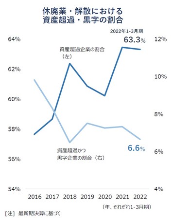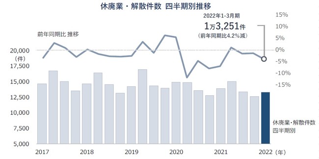 帝国データバンクは、2022年1-3月期における企業の休廃業・解散動向について調査・分析を行った。