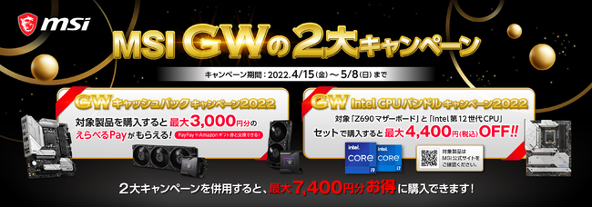 MSI、GWの2大キャンペーンを開催「GWキャッシュバックキャンペーン2022」「GW Intel CPUバンドルキャンペーン2022」