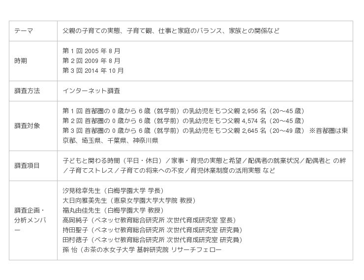 株式会社ベネッセホールディングス(本社:岡山市)の社内シンクタンク「ベネッセ教育総合研究所」では、 2014 年 10 月に、0 歳から 6 歳(就学前)の乳幼児を持つ父親 2,645 名を対象に、「第 3 回乳幼児の父親について の調査」を実施しました。この調査は 2005 年、2009 年の実施につづき 3 回目となります。9 年間の比較を通して、 父親の子育てへの関わり、教育観や父親像、ワークライフバランスに関する意識や実態を把握し、父親と家族・ 社会とのつながりについて把握しています。