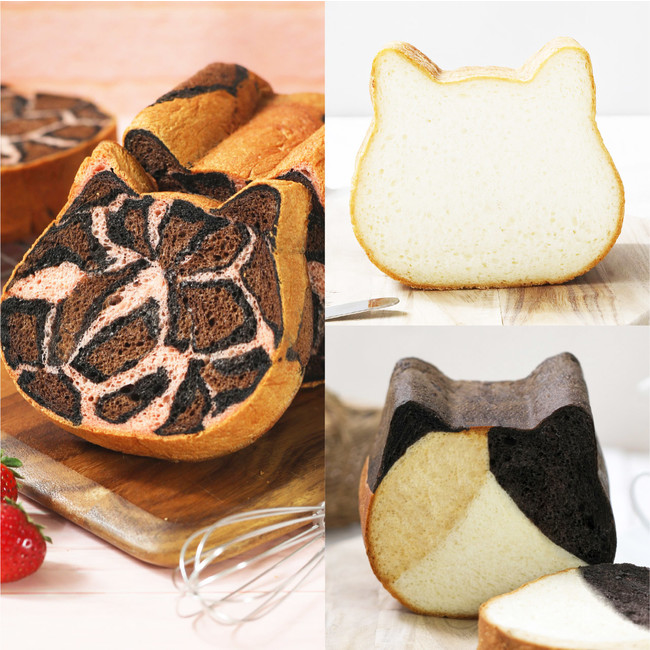 三毛猫の白、茶色、黒色模様をプレーン、キャラメル、ブラックココアで表現した見た目も三毛猫そのままなねこねこ食パンです。
