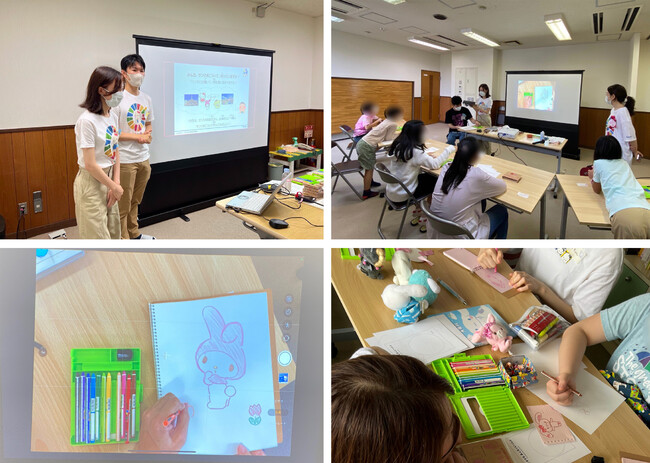 「Character Aid 〜サンリオの夏休み講座〜」は昨年、児童養護施設 品川景徳学園の子どもたちへ、サンリオが大切にしている“グリーティングカードを贈りあう文化”を体験してもらいたいと「こどもの日」に端午カードを贈ったことがきっかけとなり実施いたしました。本講座はデザイナー職の専門スキルを活かしたプロボノ支援で、絵を描く楽しさを伝えるとともに、地域の子どもたちに将来の夢を考えるきっかけと学びの場を提供する活動です。当日は、子どもたちにキャラクターの描き方を教えるデザイナー職の社員ボランティアを中心に、スマイルメンバー(障がい者従業員)も活動に参加しました。サンリオのキャラクター「シナモロール」もサプライズ登場し、子どもたちにとって夏休みの思い出に残るひとときとなりました。