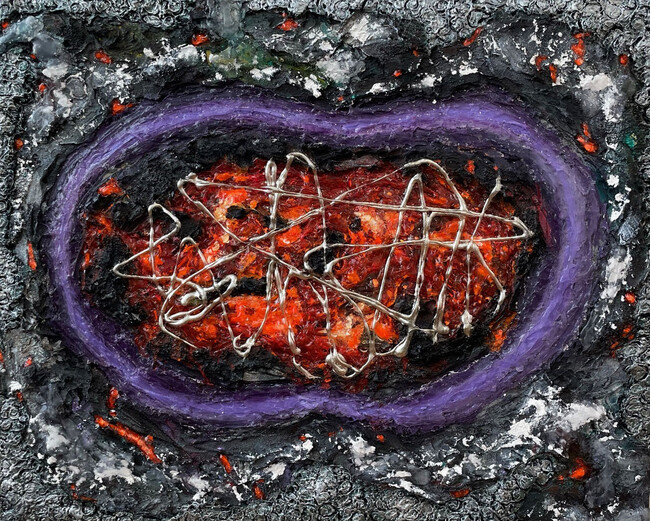 新作「STELLA」は、中央のひび割れて厚く塗り固められた部分の激しい熱を思わせる赤と、それを封じるようにかけられた銀の檻で構成されており、今までの渡邊の作品では見られなかった制作方法で様々なテクスチャーが共存しています。
