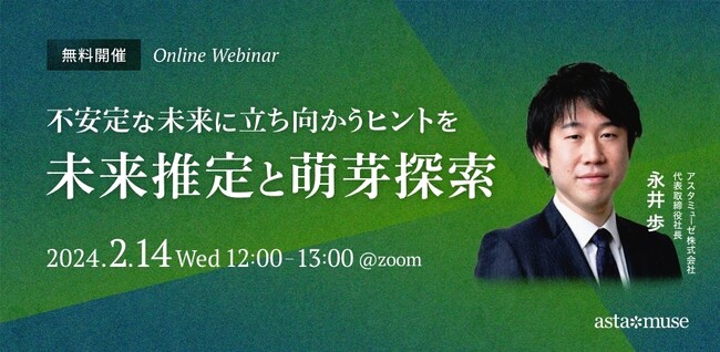 アスタミューゼ株式会社(本社:東京都千代田区、代表取締役社長 永井歩)は、2024年2月14日(水)12:00-13:00に、無料ウェビナー「不安定な未来に立ち向かうヒントを 〜未来推定と萌芽探索〜」を開催いたします。1月に実施した同タイトルのウェビナーを、リクエストにお応えして2月にも再開催いたします。