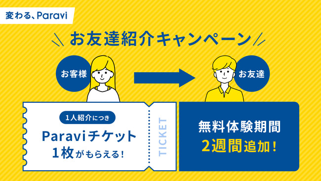 Paraviベーシックプラン会員であるお客様から紹介されたお友達が、Paraviベーシックプランに登録すると特典がつく「お友達紹介キャンペーン」では、ご紹介のお友達1人につきParaviチケット(優待チケット)を1枚付与します。Paraviチケットは、レンタル商品(一部のコンテンツを除く)を無料で視聴できるチケットです。また、ご紹介のお友達には、Paraviベーシックプランの無料体験期間が2週間追加されます。