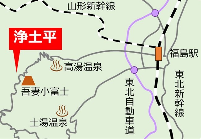 福島市の西部、磐梯朝日国立公園に属し、「日本の道100選」に選ばれた磐梯吾妻スカイラインの中間点の標高約1,600mに位置している。火山礫に覆われた荒々しい山肌をはじめ、彩り豊かな山岳湿原と変化に富んだ美しい風景が広がる雲の上の楽園。福島市内から車で約1時間とアクセスが良く、登山道、自然探勝路、ビジターセンター等の施設が充実。夜の浄土平は、標高が高く空気が澄み、周囲の光害が少ないため、満天の星空が広がる全国でも有数のスターウォッチングポイントと呼ばれる。