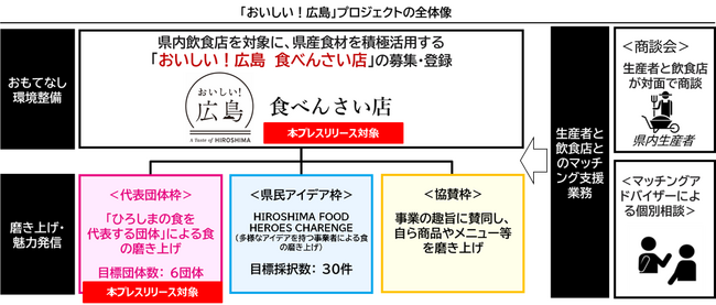 県では,県産農林水産物の販路・消費拡大を目的として,今年5月に開催されるG7広島サミットを契機に,多彩な食資産を多様な主体と磨き上げるとともに,その魅力を発信をする, 「おいしい!広島」プロジェクト(以下、「本プロジェクト」)を推進しています。