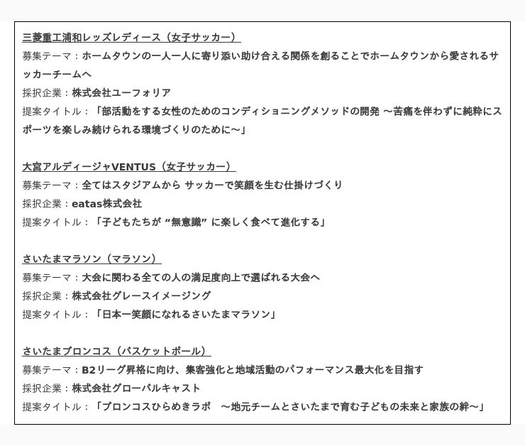 関東エリアでは、三菱重工浦和レッズレディース(女子サッカー)、大宮アルディージャVENTUS(女子サッカー)、さいたまマラソン(マラソン)、さいたまブロンコス(バスケットボール)が、共創によるビジネスアイデアを募集。