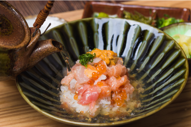 また、味変で3度楽しめることも魅力のひとつです。まずはそのままお召し上がりいただき、続いてたまごを絡めて全体をまろやかに。最後は特製のお出汁をかけて「海鮮出汁茶漬け」で〆てください!わさびや薬味もお好みで。