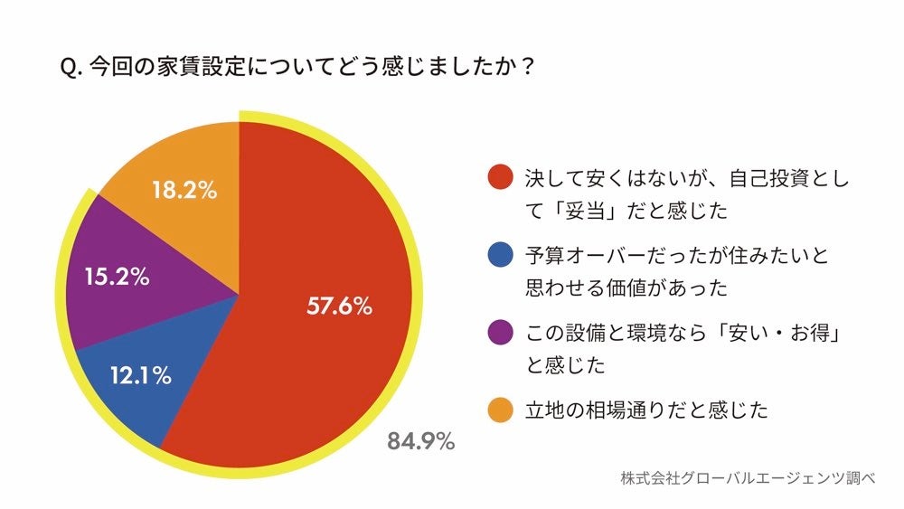 昨今の物価高騰下において、一般的に家賃は「消費される固定費」として削減対象になりがちですが、家賃設定についての設問では、84.9%が「自分への投資として妥当だと思う」または「予算オーバーでも住みたいと思える価値がある」と回答しました。