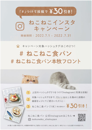 ・内容:ご自身のインスタグラムに下記の2つのハッシュタグを付けて「ねこねこ食パン」を投稿していただき、「♥15いいね」をゲットすると、ねこねこ食パン1本が30円引きになります。