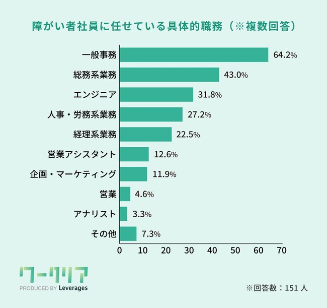 1年以内に雇用した障がい者社員には、約7割の企業が障がい特性に配慮した業務を任せています。具体的な職種(職務)について、最も多かったのは一般事務(64.2%)となり、次いで総務系業務(43.0%)、エンジニア(31.8%)と続きます。
