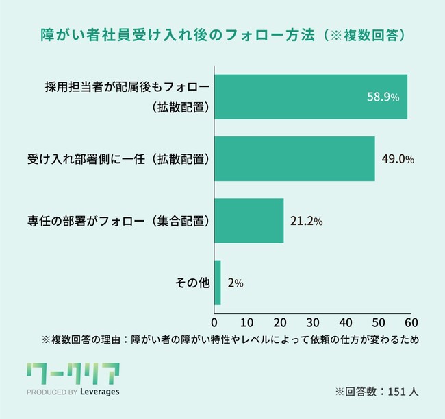 障がい者社員の受け入れ後のフォローについては、約6割の企業が採用担当者が配属後もフォローしています。これは、障がい者社員のフォローのしやすさと、採用担当者が現場の状況まで知ることで、マッチする人物像も把握できることから、次の採用に繋げやすいことも理由として考えられます。(※いずれも複数回答)