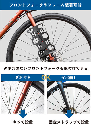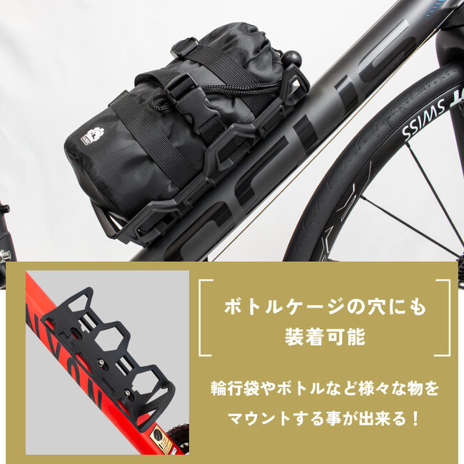 フレームやフォークに取り付ける多用途ケージ、ダボ穴が無くても取付け可能なマウントストラップが付属しています。空いたデッドスペースを有効活用して、ロードバイクやクロスバイクなど様々な車種に取付可能です